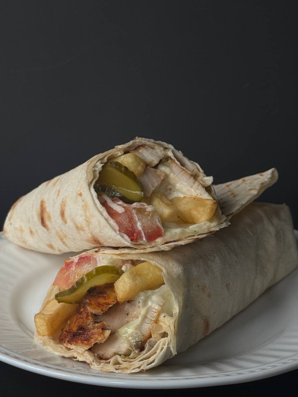 Лаваш, куриное мясо, картофель фри, маринованные огурцы, томаты, соус чесночный