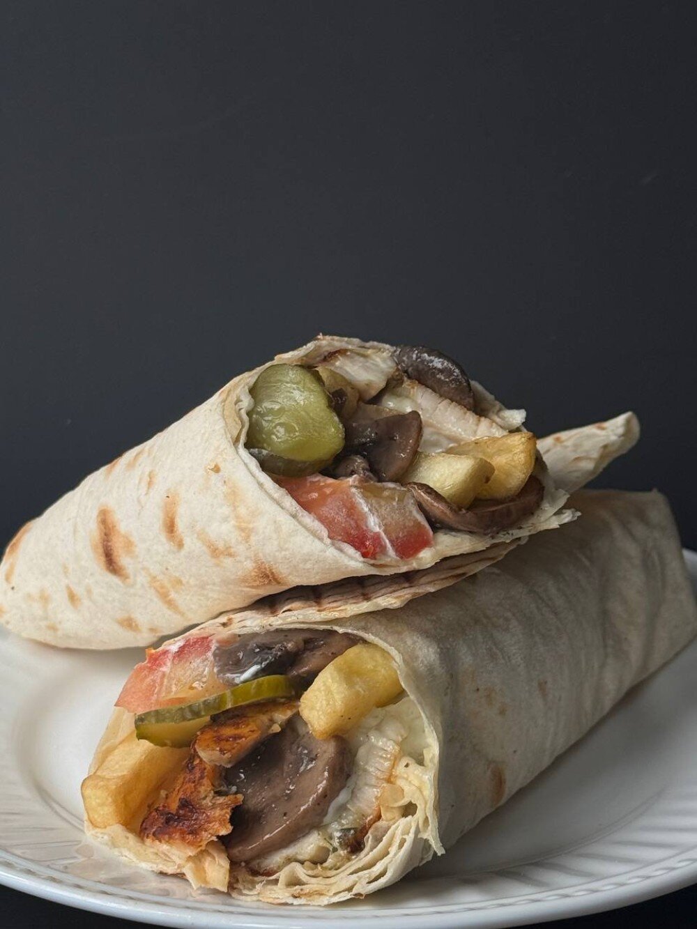 Лаваш,куриное мясо, соус грибной, обжаренные шампиньоны, томаты, картофель фри, маринованные огурчики,томаты, соус чесночный