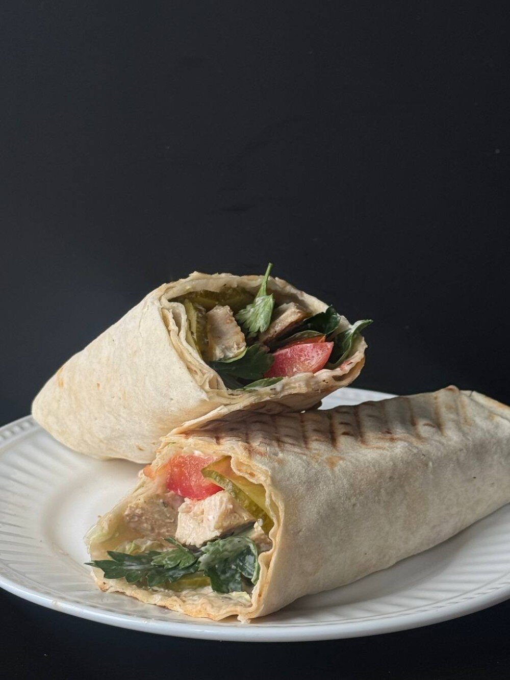 Лаваш, курица с вертеля, петрушка, огурец маринованный , томаты, соус чесночный, аджика